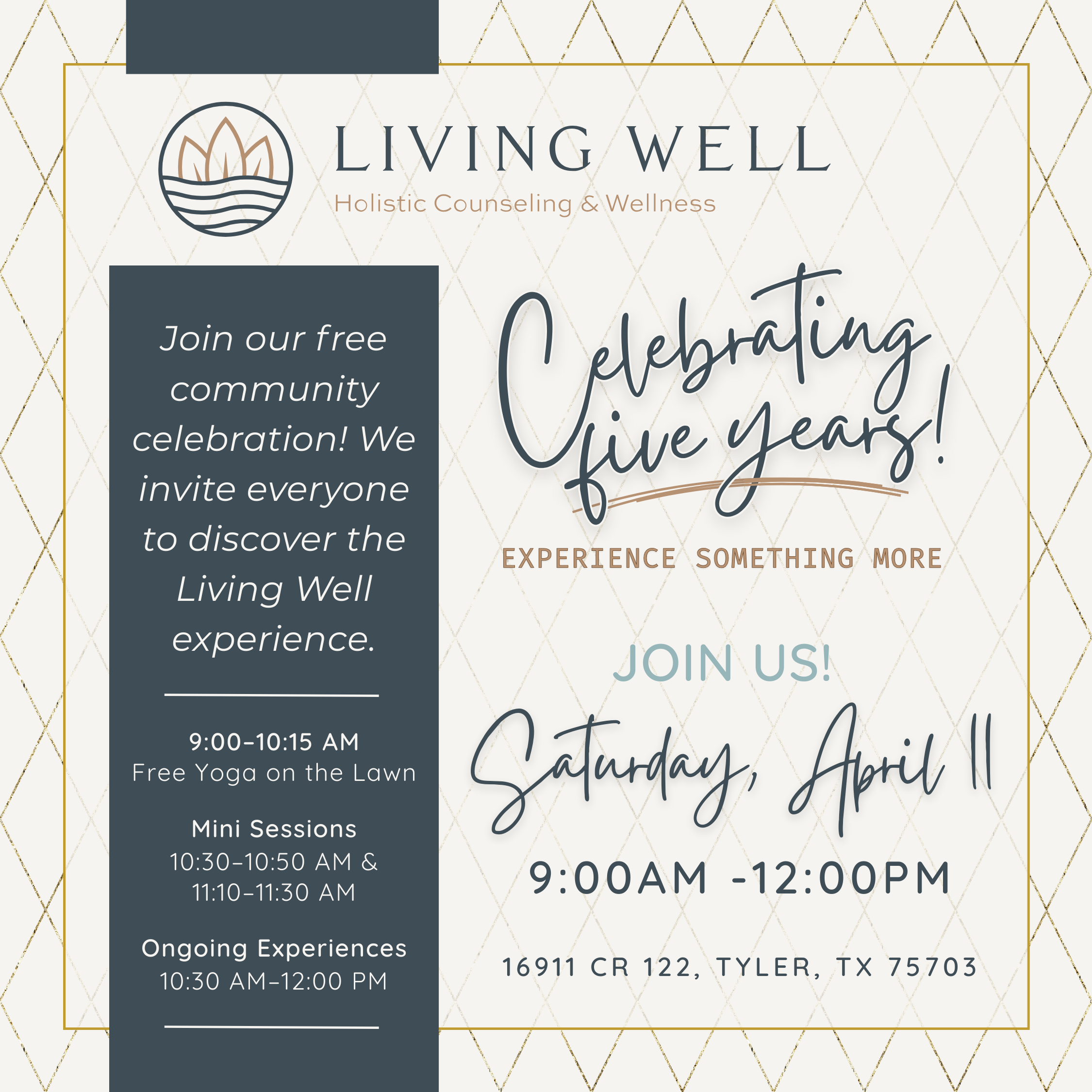 Join Us on April 11 On Saturday, April 11, we’re opening our doors for a special anniversary celebration. It’s a relaxed, welcoming morning designed to help you experience what makes Living Well different. We’ll begin the day with free yoga on the lawn from 9:00–10:15 AM. It’s open to everyone and is the perfect way to […]